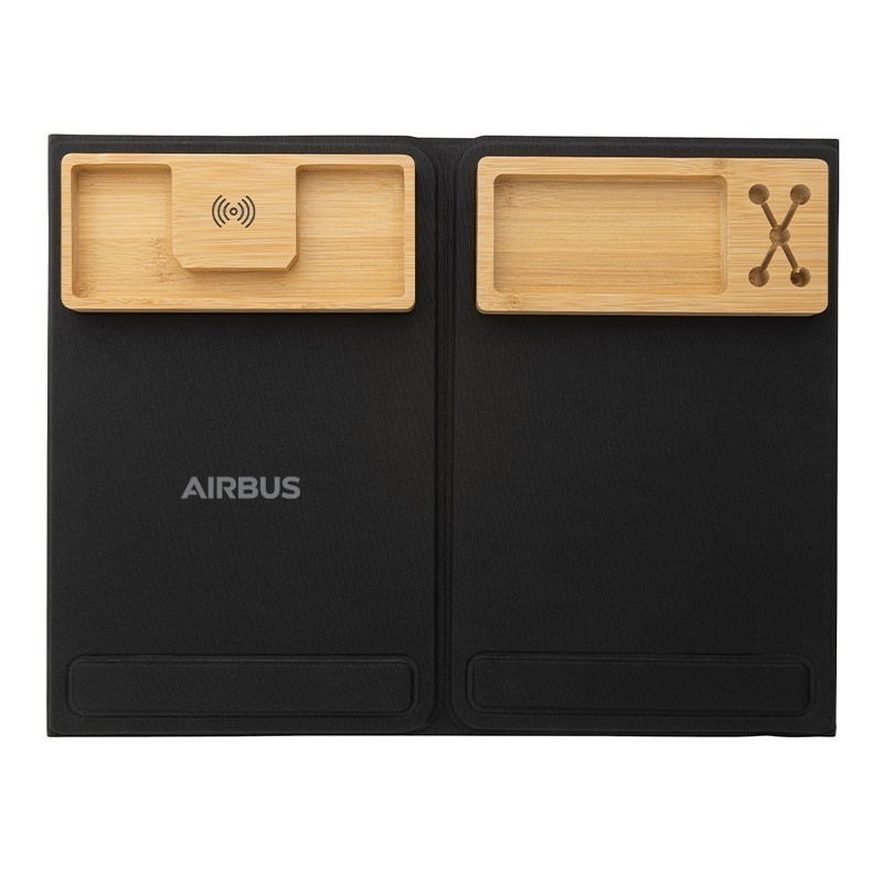 Inside the organizer, you'll find a 10W wireless charger made of bamboo, along with pen holders and a triple-fold easy laptop stand (max 17").