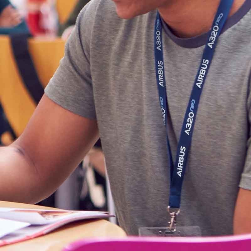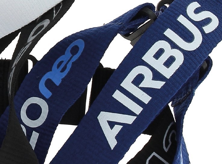 A320neo wide lanyard made of 100% PET recycled polyester, sublimated with Airbus and A320neo logo. With a safety fastening and cell phone holder.