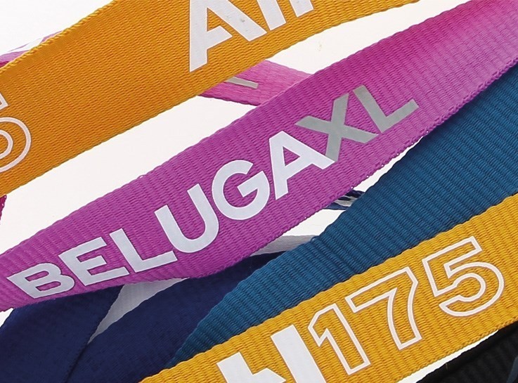 BELUGA XL wide lanyard made of 100% PET recycled polyester, sublimated with Airbus and BELUGAXL logo. With a safety fastening and cell phone holder.