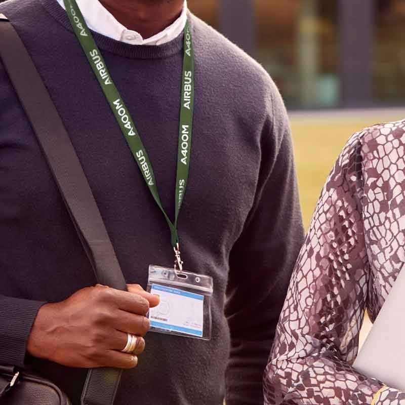 A400M lanyard made of 100% PET recycled polyester, sublimated with Airbus and A330MRTT logo. With a safety fastening and cell phone holder.