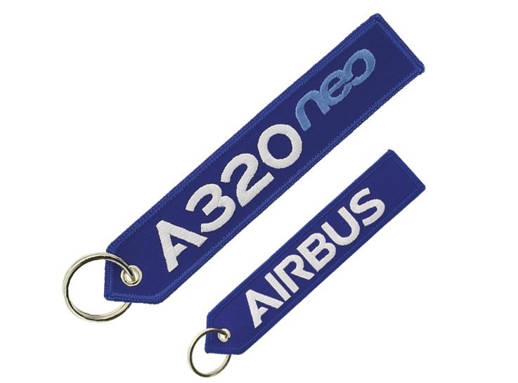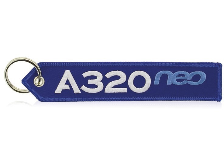 Original cult "We make it fly" key ring and luggage tag. Reinforced edges, strong eyelets, A320neo lettering. Large size: 160 x 30 mm