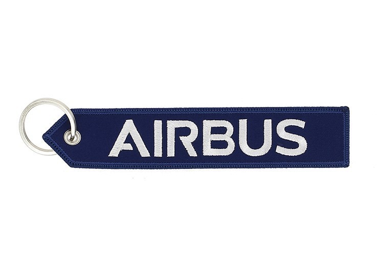 "We make it fly" blue key ring and luggage tag. Reinforced edges, strong eyelets, Airbus lettering. Large size: 160 x 30 mm