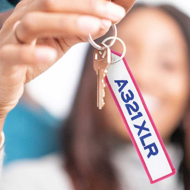 Airbus key ring and luggage tag. Reinforced edges, strong eyelets, A321XLR lettering. Large size: 160 x 30 mm. oxo degradable plastic packaging.
