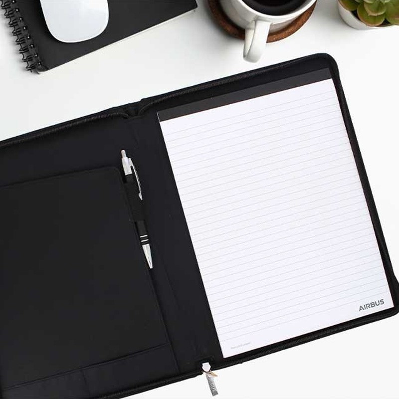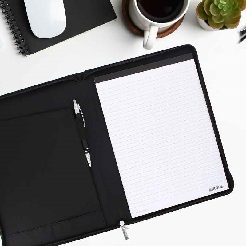 Made from rPET, a material derived entirely from recycled plastic. This conference folder is a highly useful desk accessory with multiple interior compartments (for business cards and document sheets), and includes an A4 notepad inside.