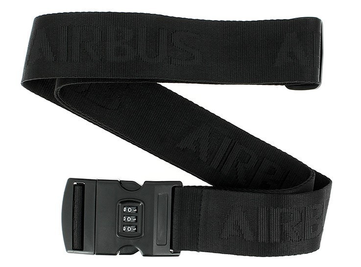 Airbus logo woven luggage strap, secured with a plastic buckle, features a programmable 3-digit combination for security. Adjustable strap can be used horizontally and vertically.